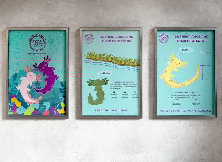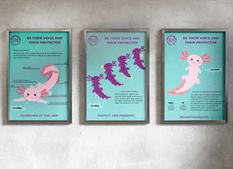 The objective is to promote education and participation of the local and foreign public, as well as fundraising, through posters, visits to their habitat, along with explanations about their importance and care of their habitat. The designs will be inspired by the axolotl and its habitat, incorporating organic visual patterns using a cute, aesthetics and fun style.